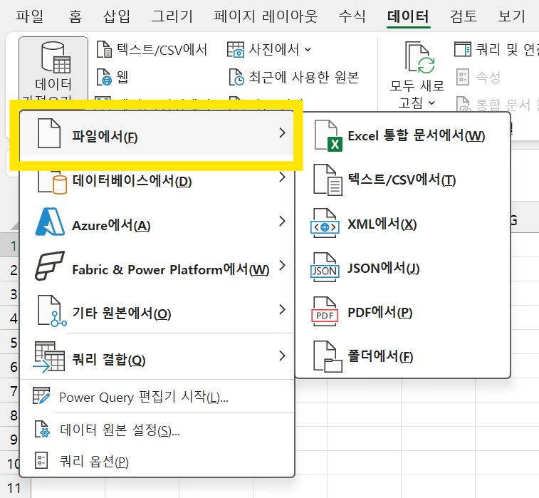 다들 아시다시피, 엑셀 자체에도 데이터를 불러오는 기능이 기본으로 있습니다.