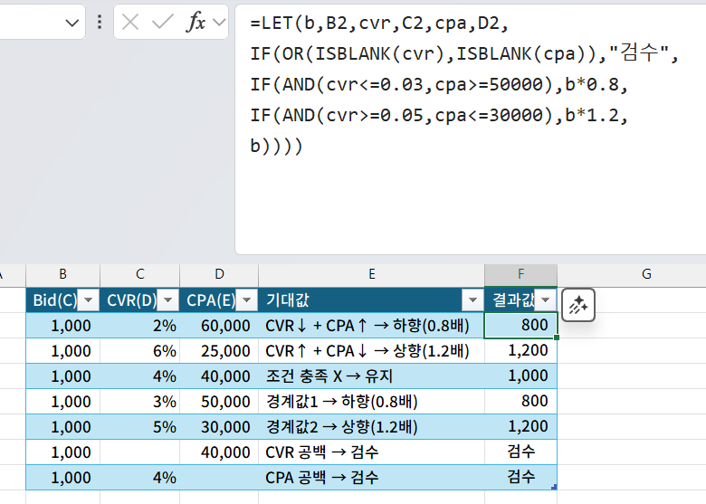 데이터 구조: C열 Bid, D열 CVR, E열 CPA / CVR, CPA 공백이면 “검수”