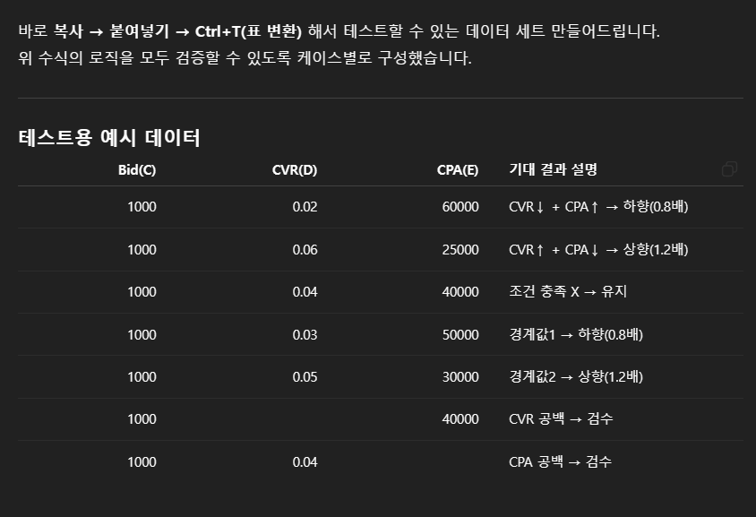 (예시) 전환율이 기준 이하일 때 입찰가를 자동으로 조정한 값을 출력
